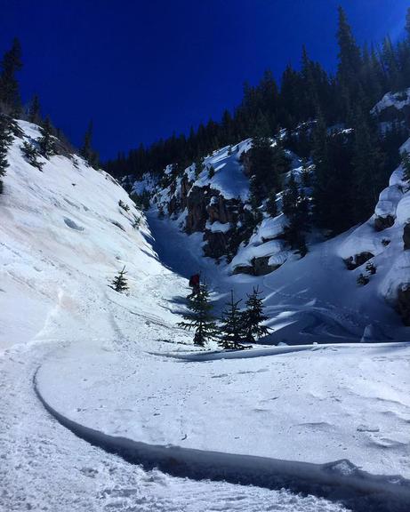 photo - Peter Bracker and Zach Taylor riding the exit gully below the north face of Kendall. photo by Peter Bracker, 2016.