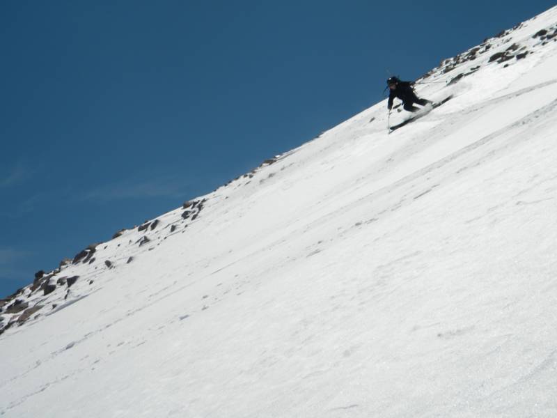 It was fun but all good things must end.....and we were itching to make some turns. We put our clothes back on and made our way back down to the false summit where our glise gear awaited. We strapped in and dropped in one at a time enjoying corn turns down the northeast face of Kings.