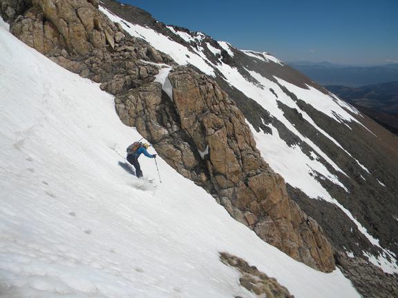 We scrambled across a few rocks about halfway up the ridge and then were able to skin for the last 1/3 or so of the ridge. We made it to the summit at 10:25. In a hurry we transitioned and began to ski down the ridge to the top of the Armchair. We dropped in at 10:30. This was a half hour later than Frank and Brittany Walker and Chris Davenport skied it after starting at the same time so I did not feel too bad about the speed we moved with over the course of the day. The snow corned up nicely as we dropped in to the low angle slopes leading to the top of the Armchair. I was still a little worried we were too late for the face. Ben dropped in and made a slope cut. Good corn and not too sloppy! We were on the late side of perfect but the snow was pretty nice and not water saturated enough to be dangerous. We skied one at a time down the face picking our way through cliff bands on 40 to 45 degree snow. The drop of the face is about 2000'.